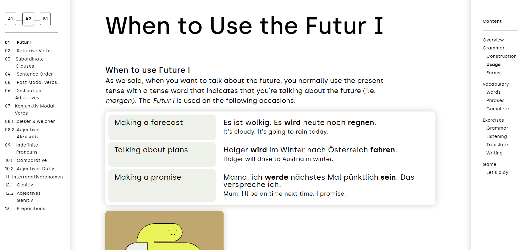 "The content is really good and I recommend the website a 100%. The materials are great and helped me to learn quickly while having a competent teacher on my side. The classes are absolutely great!"